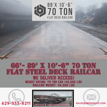 66' to 90' Flush Steel Deck Flat Railcars. 9' wide Smooth 3/8" metal flooring. 70 Ton Car Rating.