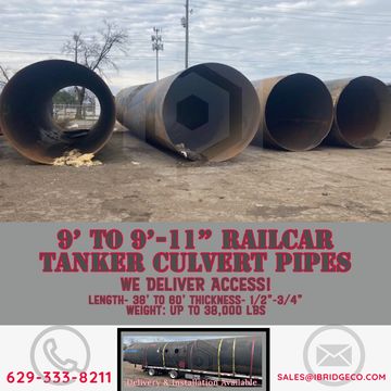 TANK CAR STEEL RAILCAR TANKER CULVERT PIPES UP TO 60' LONG AND 10'-6" DIAMETER